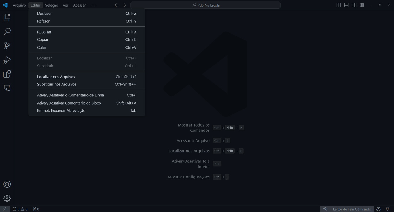 O VS Code funciona bem com softwares leitores de tela, que são tecnologias assistivas para tornar possível o acesso ao computador por pessoas cegas ou com baixa visão.