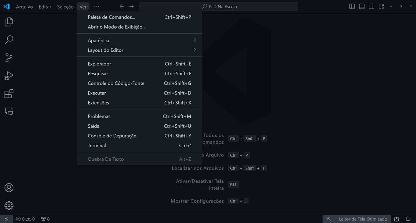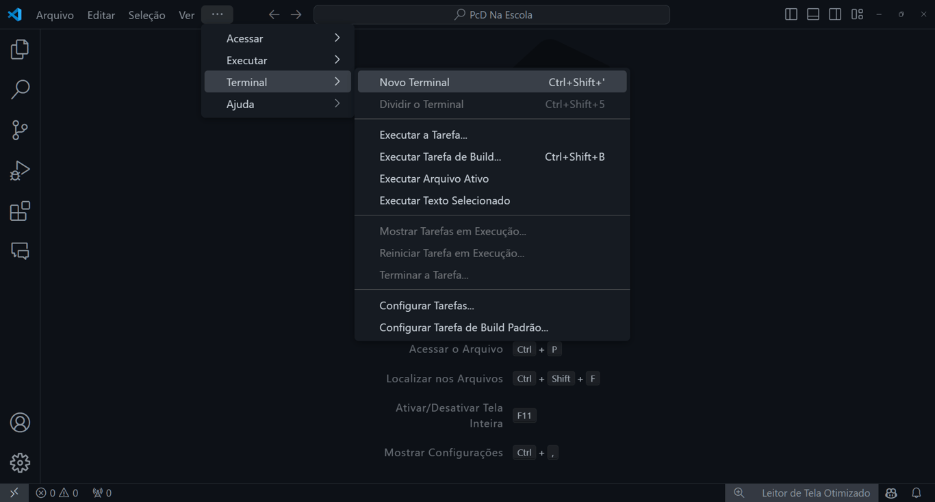 Pressione Ctrl + ` (tecla acento grave, localizada ao lado do número 1 no teclado) para abrir o terminal integrado. O NVDA anunciará "Terminal", seguido do nome do shell padrão que está sendo usado (por exemplo, "PowerShell", "Bash", ou "Command Prompt"). |