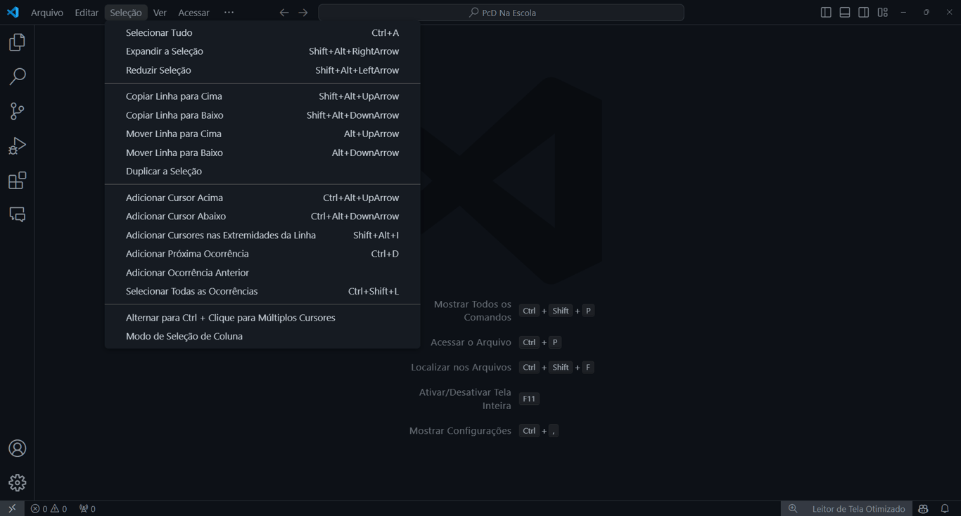Lembre-se, sempre que tiver dúvidas, ou quiser consultar todos os atalhos de teclado disponíveis, você pode acessar a Paleta de Comandos pressionando Ctrl + Shift + P e digitar “Keyboard Shortcuts” para ver a lista completa. É sempre bom ter essa referência à mão.